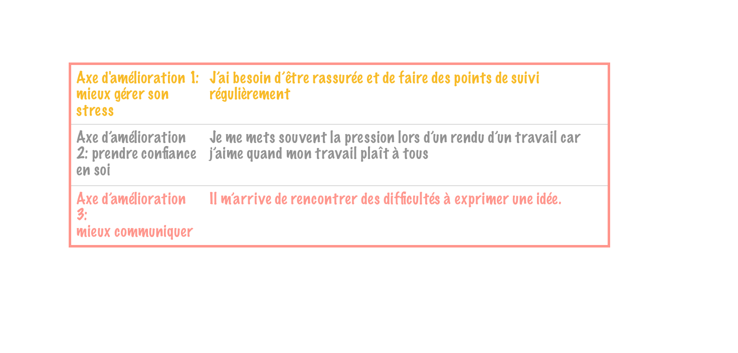 Après avoir analysé mes forces, il me semble important de mettre en évidence mes faiblesses afin d'identifier mes propres axes de progression.