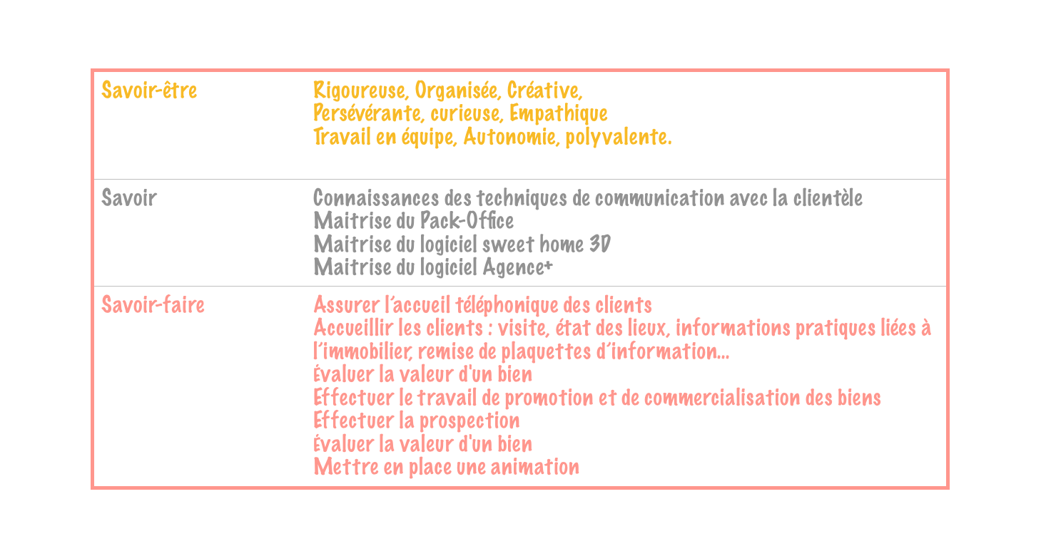 Durant mon parcours professionnel, j'ai acquis un grand nombre de compétences ce qui me permet aujourd'hui d'être opérationnelle sur le terrain.